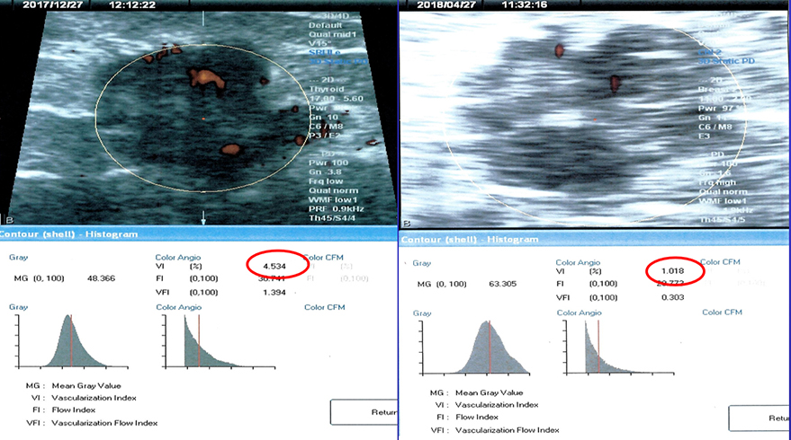 Once you have a vascular map of the cancer, we have the initial vessel density of 4.5%. Successful treatment over weeks or months will bring it down. In this case, it's down to one quarter of the initial treatment so this is treatment success. This is quantitative mapping of treatment follow-up because if it's working, it's better to change treatment, to avoid the side effects of chemo or other immunotherapies.