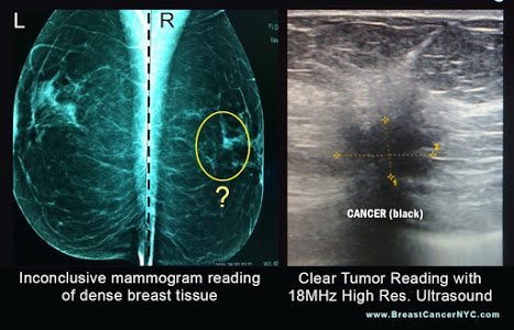 Mammograms of dense (lumpy) breasts have an elevated miss rate since tumors are white and dense breast tissue is white. Cancer tumors on ultrasound appears as black on a white background. Experience shows that ultrasound is typically more effective and accurate in thin women with dense breasts.