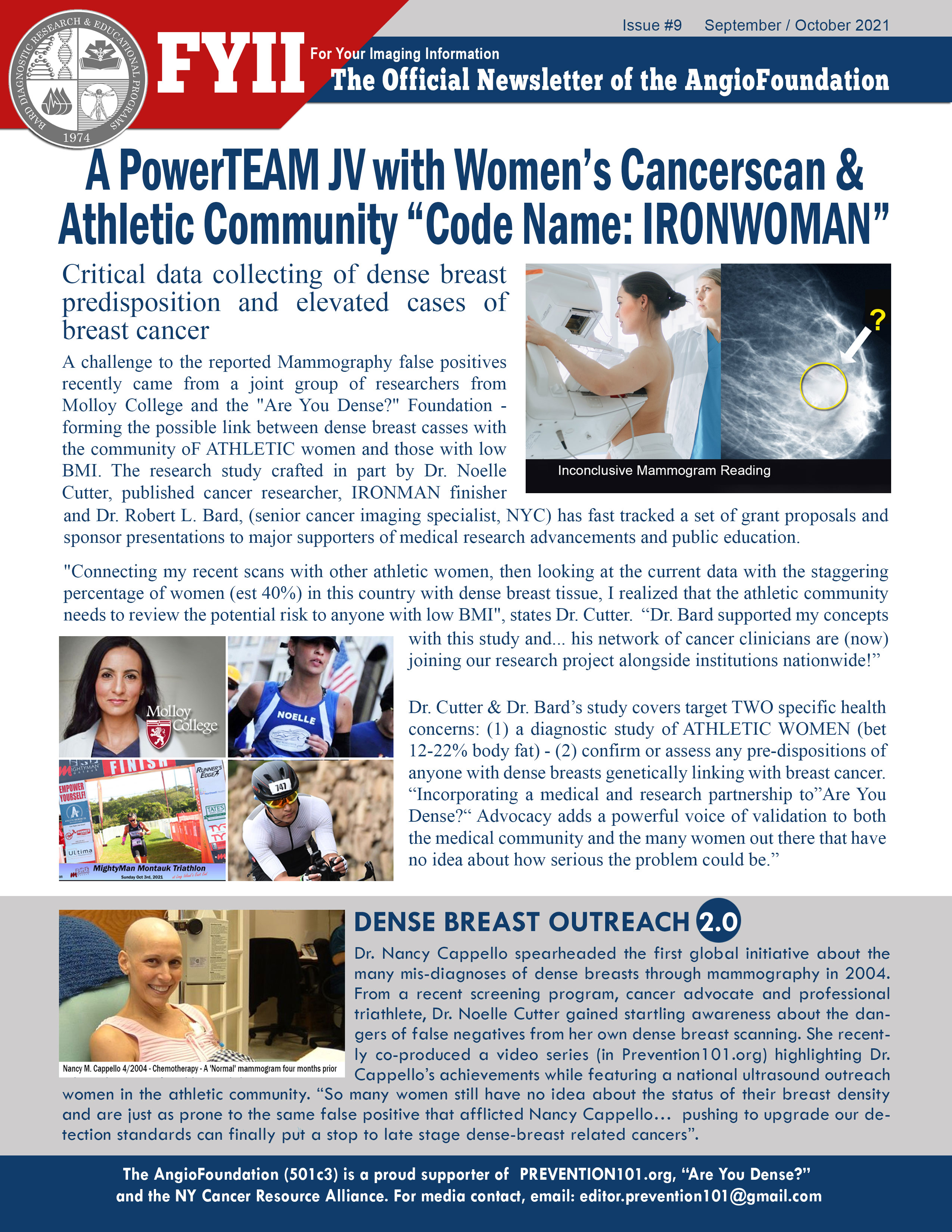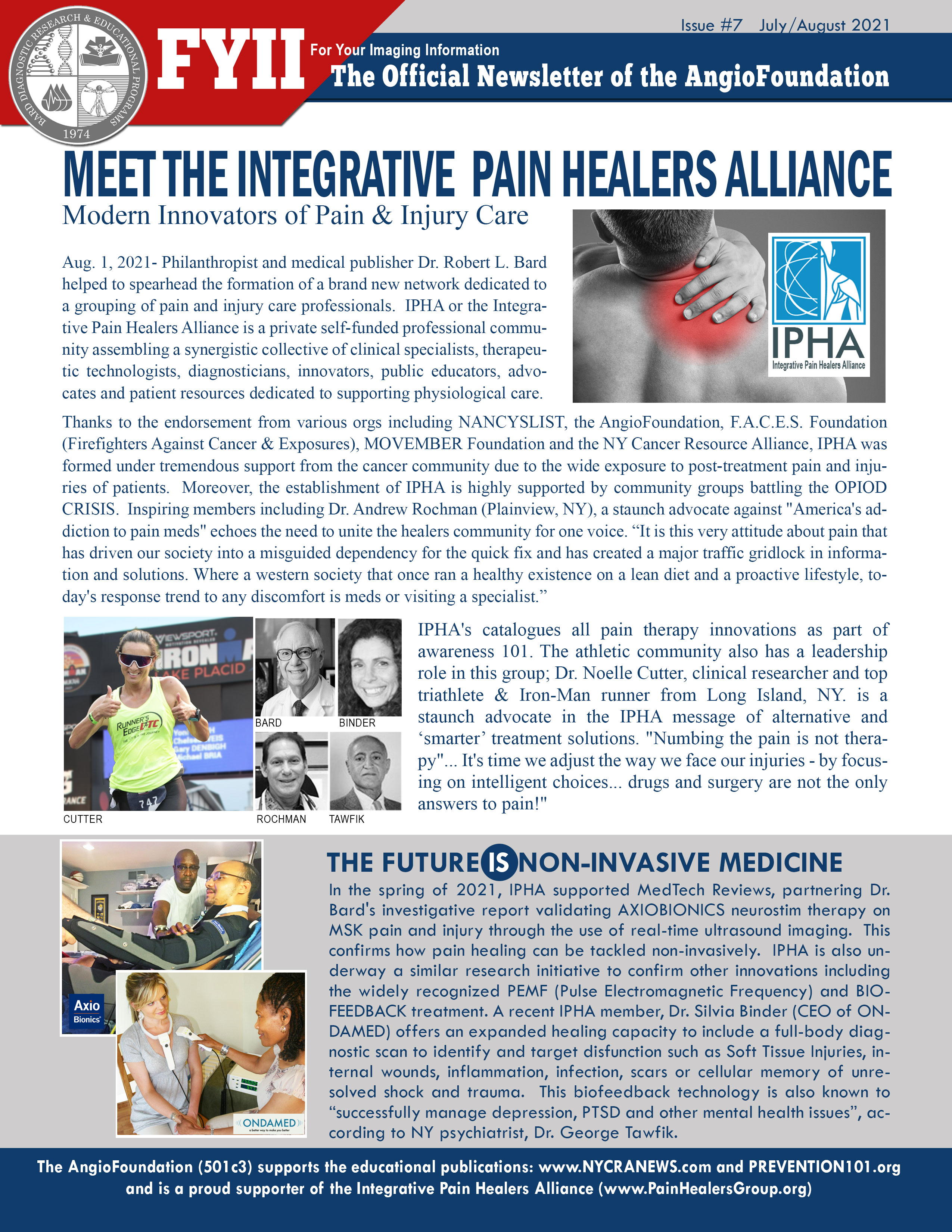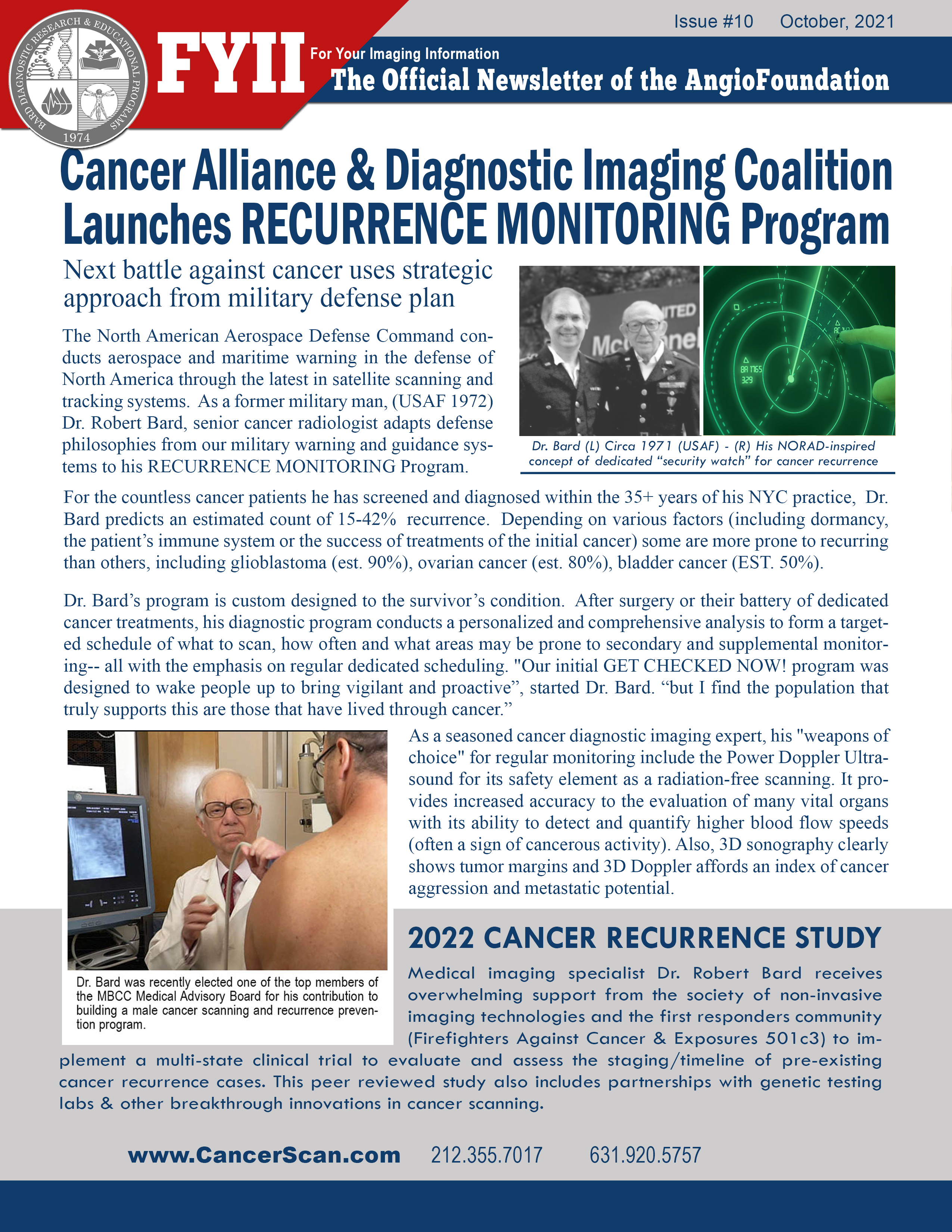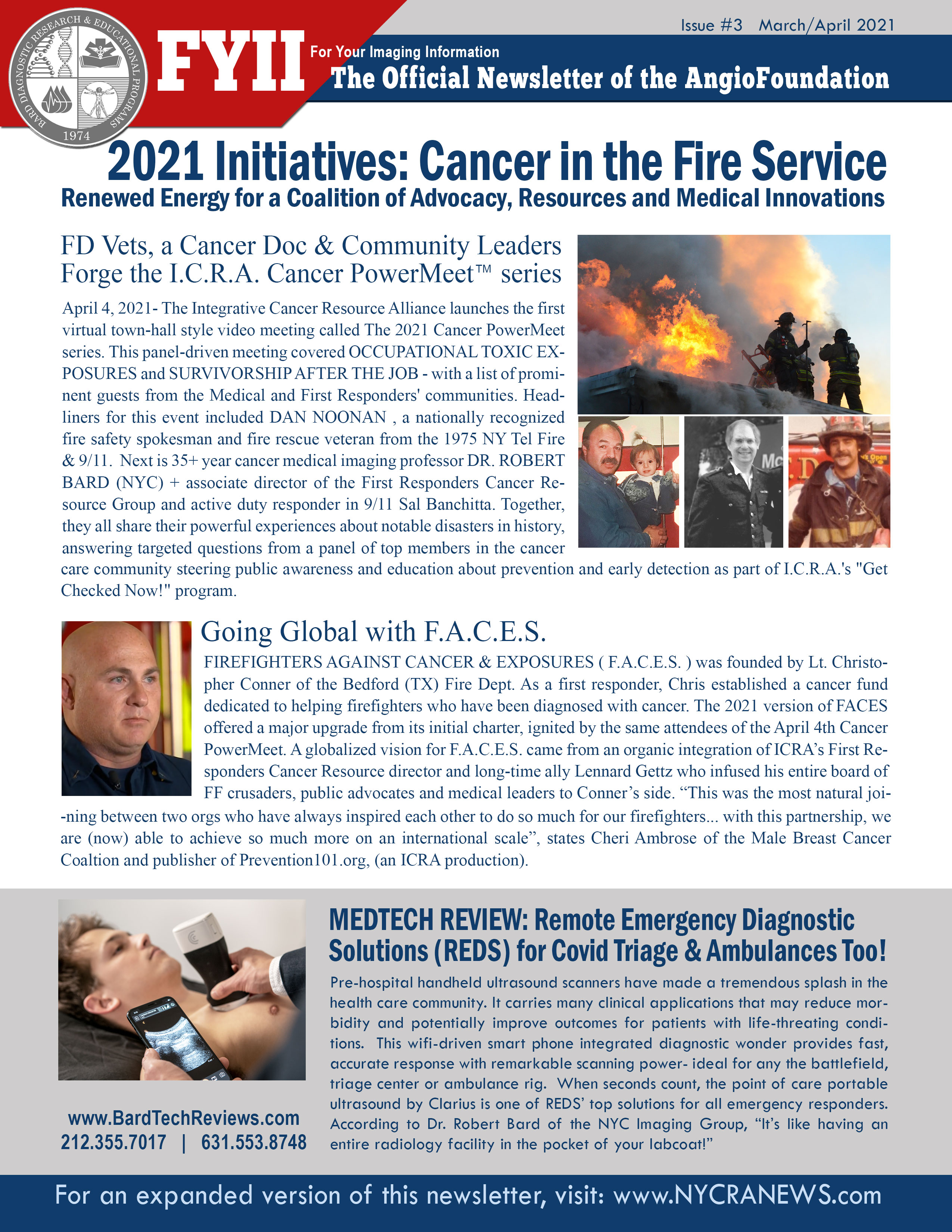 ANNC: AngioFoundation newsletters (PDF's) • Issue 1: Intro Medical Seminar Series • Issue 2: Heavy Metal Deposits x Env. Toxins • Issue 3: Cancer in the Fire Service / F.A.C.E.S. Issue 3A: SALTY/ Toxins ON Rescue Workers • Issue 4: Burn Pits Cancers Ref: FF Toxic Exposures • Issue 5: National POCUS Training Program • Issue 6: Mental Health Research for Covid Disorders • Issue 7: Meet IPHA: The Integrative Pain Healers Alliance • Issue 8: Dense Breast Screening Pilot • Issue 9: Dense Breast Research (Feat. Dr. Noelle Cutter) • Issue 10: NORAD Inspired Recurrence Tracking