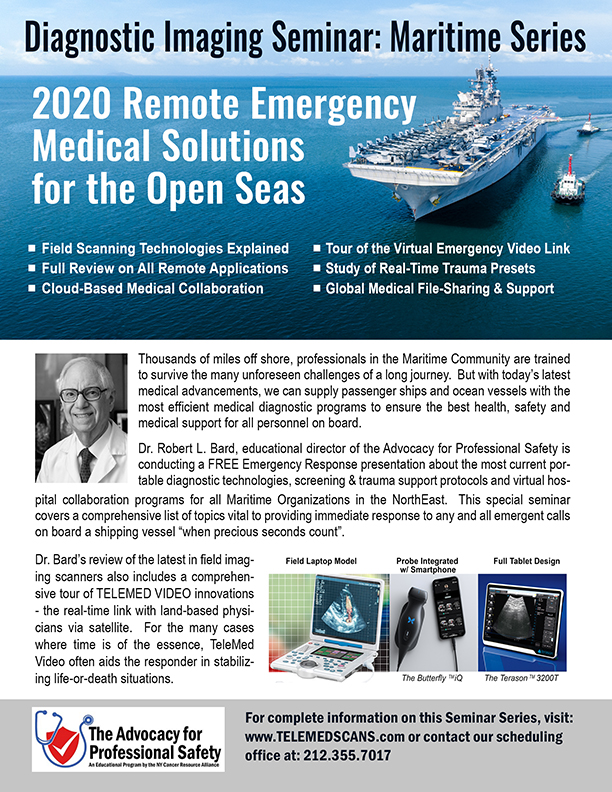 Flyer: (Maritime 2) "Portable Ultrasound Goes Anywhere" (1pg) (updated content + Clarius image)= Educational Seminar- Med Diagnostic Programs